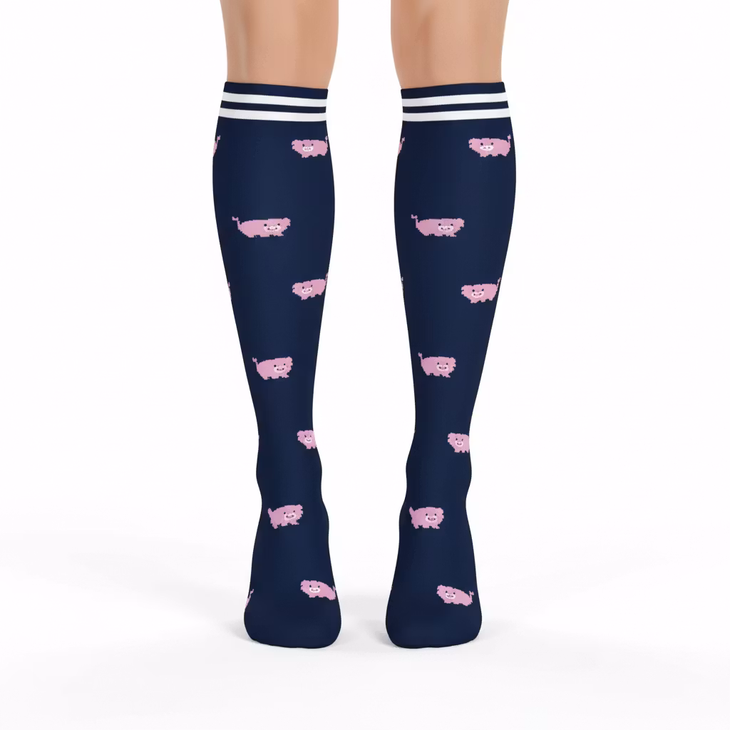 Stödstrumpa mörkblå med rosa grisar